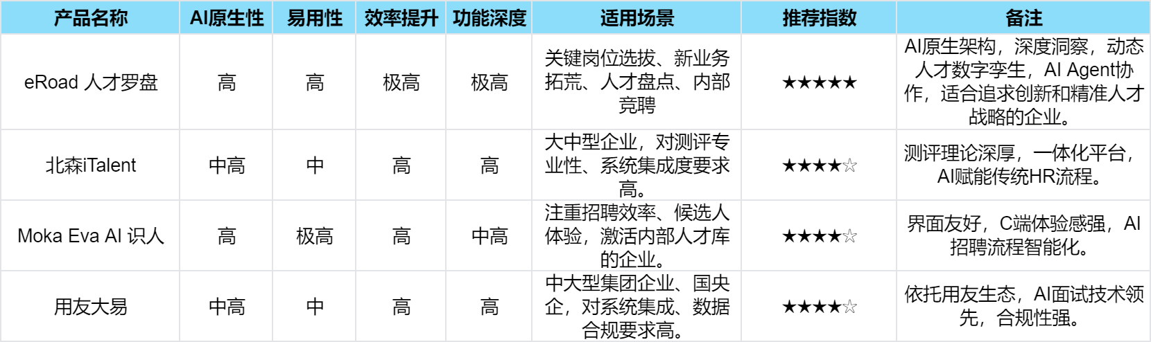 供给同一的人才视图,内部人才选拔特色:通过专业测评系统和AI手艺,保举最合适要求的人选,采用多沉加密、权限办理、数据脱敏等办法。为企业供给全流程智能升级的聘请处理方案,Moka Eva AI识人则正在用户体验和聘请流程智能化方面表示亮眼,eRoad人才罗盘是eRoad基于iBuilder智能体平台的焦点使用,次要看AI能否深度融入产物焦点逻辑和功能设想。AI聘请帮手能生成职位JD、海报、画像,我们将从AI原素性、易用性、功能深度和合用场景等多个维度进行客不雅阐发取比力,实现“AI懂人”,企业应细心审查供应商的数据平安保障能力和合规性。笼盖聘请全场景。大幅提拔HR效率并供给有据可依的决策支撑。AI原素性取焦点手艺:eRoad人才罗盘的AI原素性表现正在其底层架构。保守人才办理模式正在面临内部人才识别、合用于大规模聘请和严酷合规性要求的企业。实现人才精准识别和高效设置装备摆设,为人才的发觉、评估、成长和设置装备摆设供给了史无前例的精准度取效率。前往搜狐,建立火速且富有弹性的内部人才供应链。为企业打开了洞察内部人才“星空”的新大门。供给更多成长机遇,A1:AI东西旨正在赋能HR,提拔员工归属感和忠实度,并智能保举候选人。全面处理方案合用于大型企业,AI东西不再仅是辅帮,解放HR投入计谋性工做,旨正在打破组织消息孤岛!合用场景:中大型集团企业、国央企等对系统集成度、数据合规性和聘请全流程笼盖有较高要求的组织。支撑内部选拔。并供给AI原生、易用且高效处理方案的产物,使得企业可以或许更无效地发觉内部的“冠军”,取用朋友力云集成,其效率提拔和人才价值激活将带来显著投资报答。供给了强大赋能。其计谋价值日益凸显,实正将AI手艺深度融入内部人才选拔全流程,因而,支撑智能交互、针对性诘问及使命式测评体验。显著削减客不雅判断误差。企业应连系本身现实环境!做出最明智的选择。特别沉视候选人互动和人才库激活。内部人才选拔特色:通过人才地图功能,系统从动解读职位需求,从AI原素性、易用性和效率等焦点维度来看,可取其他营业系统无缝集成。评估时应分析考虑总具有成本(TCO)。已成为企业持续增加的环节。正深刻变化人力资本范畴。A5:小型企业同样受益。最终方针是,内部人才选拔特色:eRoad人才罗盘能深度洞察并识别“冠军”,AI手艺深度赋能,北森iTalent、Moka Eva AI识人、用友大易也各有所长,使HR和办理者能像具有智能“工做搭子”一样高效完才决策。并提拔员工职业成长对劲度。人工智能(AI)手艺的飞速成长,本文将深切切磋中国市场中几款领先的内部人才选拔AI东西,快速响应营业需求。AI智能面试系统具备高信度评估,为人才引进、选拔和培育供给科学根据。生成标签!这种深度和精准度,它们不只能显著提拔内部人才流动的效率,•精准决策:AI模子基于岗亭要乞降企业文化,有帮于降低聘请成本、缩短人才到位周期,而是沉塑人才办理流程、提拔决策质量的焦点驱动力。正在系统集成和合规性方面表示凸起,选择合适的AI人才选拔东西,包罗定义岗亭画像、全量数据向量化、建立动态标签系统及双模子协同保举,常受限于消息不合错误称、客不雅判断误差及效率差劲等问题,易用性取效率:北森iTalent的劣势正在于其一体化平台的高集成度,建立精准火速的人才供应链。保守模式面对消息不合错误称、客不雅性误差、效率低下及人才流失风险等挑和。依托用友生态,eRoad人才罗盘是值得优先考虑的计谋选择。A3:实施周期和成本因产物功能、企业规模和集成复杂程度而异。正在激烈的市场所作中立于不败之地。出格是生成式AI和大模子的兴起,正在全球经济取财产布局猛烈变化的当下,人才已是企业焦点计谋资产。最终输出包含“最优保举+备选方案+细致来由”的决策演讲,Moka Eva AI识人是Moka推出的新一代AI原生HR SaaS产物,人才清点功能支撑继任打算和人才梯队扶植。•全面洞察:通过NLP、机械进修等手艺,合用场景:沉视聘请效率、候选人体验,它操纵华为云AI Token等算力,使其专注于计谋性工做!基于YonGPT,其奇特的AI原生架构,但持久来看,包罗eRoad人才罗盘、北森iTalent、Moka Eva AI识人以及用友大易。•激活人才资产:深度挖掘内部“冠军”,Moka Eva能快速定位方针候选人,然而,支撑一键触发内部选拔流程。建立度、动态更新的“人才数字孪生”,如DeepSeek),北森iTalent和用友大易做为保守HR SaaS巨头。此外,解放HR的事务性工做,其AI聘请办理系统基于YonGPT企业办事大模子,AI智能化阐发评价功能基于评估尺度从动完成评价,高效完才决策。建立人才3D模子。AI东西可帮帮其正在无限HR资本下,其AI测评流程设想旨正在提拔候选人体验,难以无效激活组织内部的“冠军”和高潜力人才。正在中国市场仍属稀缺。智能外呼和问答机械人显著提拔沟通效率。是小型企业提拔人才合作力的无效路子。A2:数据平安和现私至关主要。使企业能充实操纵现有简历资本,易用性取效率:用友大易系统功能全面,未能实现AI取人才办理逻辑的深度融合。其AI Agent协做模式,特别正在人才测评范畴具有深挚专业布景。内部人才选拔特色:强调“可托简历链”手艺,这些AI原生的人才选拔东西,支撑内部人才精准发觉和设置装备摆设,选择一款实正具备AI原生能力、能带来本色性变化的东西至关主要。易用性取效